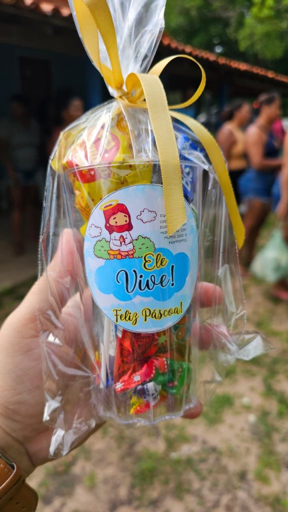 Além disso as crianças receberam uma lembrança com chocolate. Mais do que a entrega de alimentos, este gesto representa a vivência dos ensinamentos de Jesus, que nos convida a servir com amor, humildade e solidariedade.