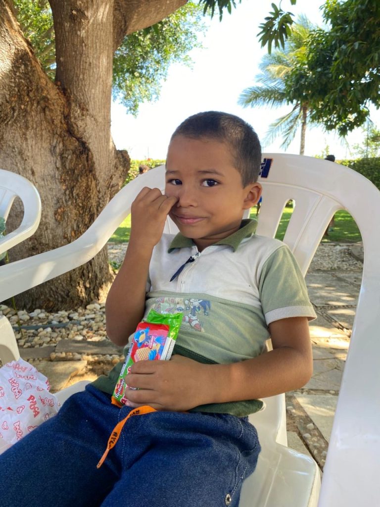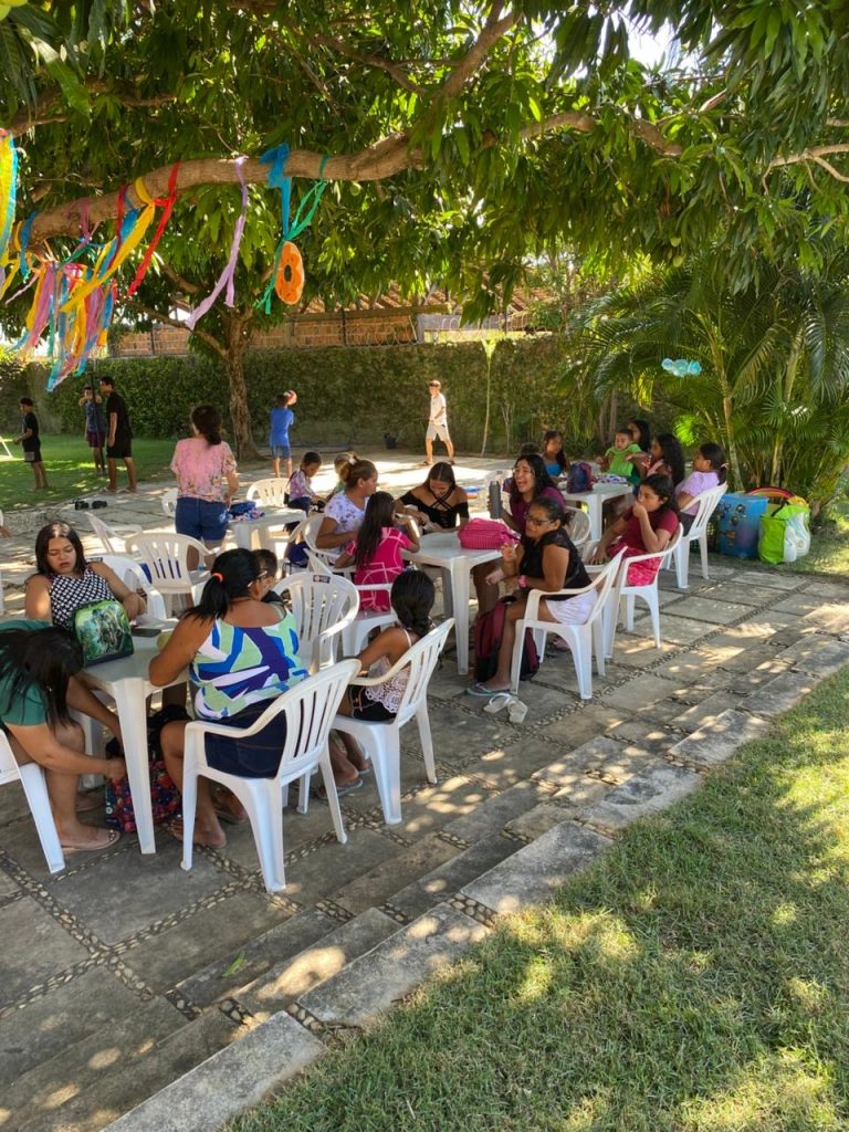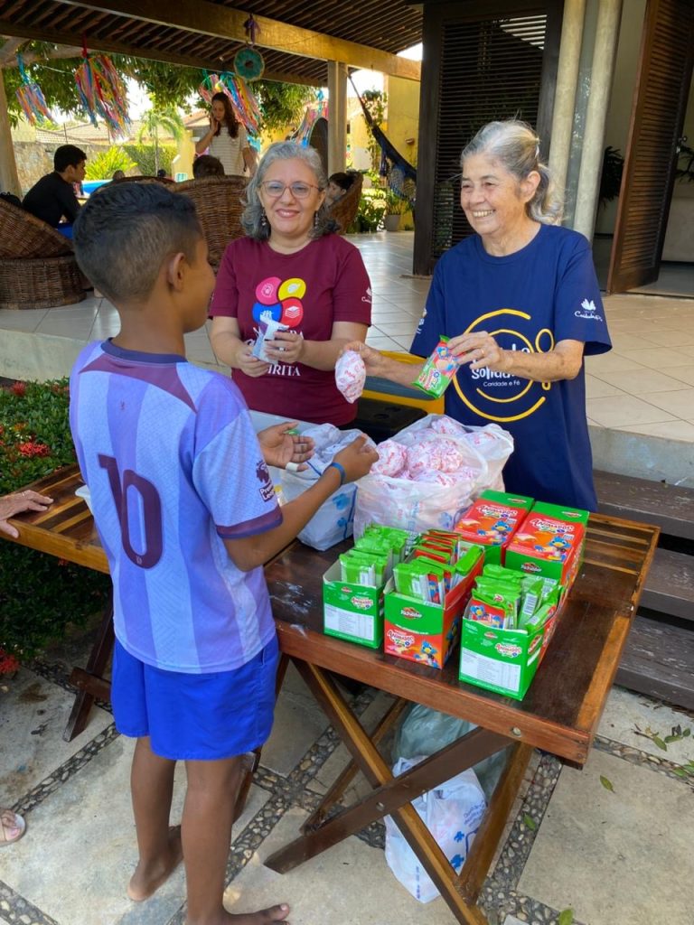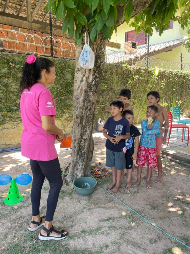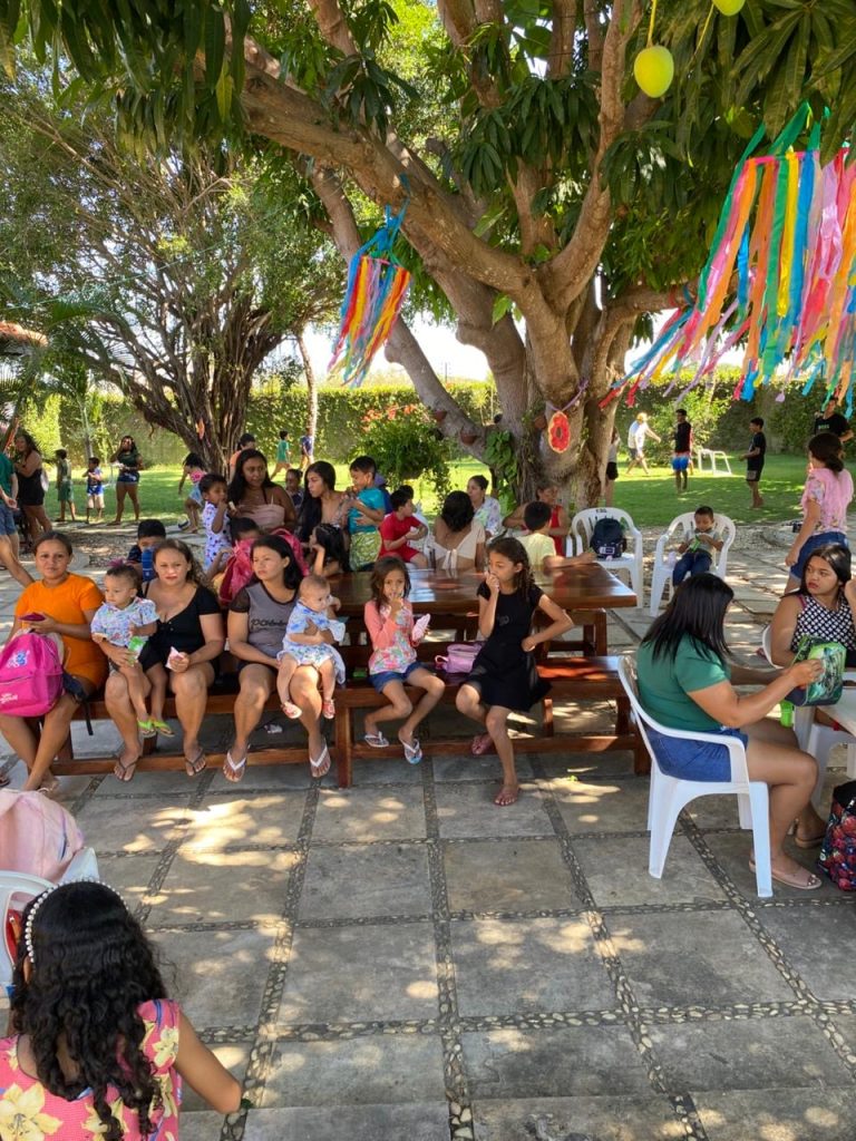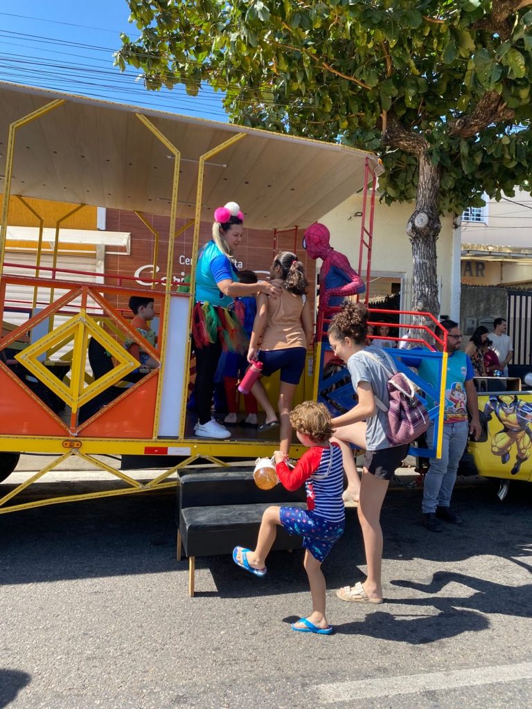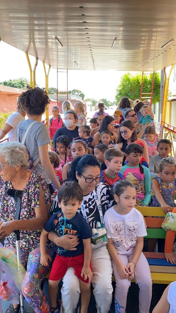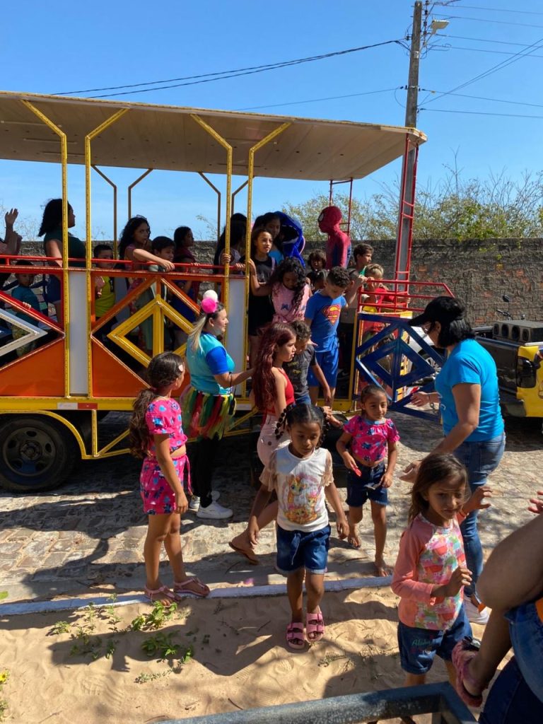 A programação começou cedo, com o passeio de trenzinho e ônibus até o local da ação, onde as crianças foram recepcionadas com lanche. Após a chegada de todos, foi feita uma prece e dadas as orientações para o início das atividades.