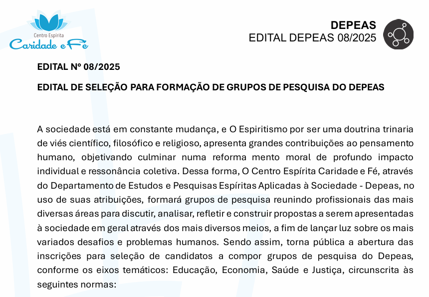 No último dia 31 de outubro de 2025, durante o evento de lançamento da Revista Rivail, o DEPEAS – Departamento de Estudos e Pesquisas Aplicados à Sociedade, abriu as inscrições para a seleção de pesquisadores nas áreas de Saúde, Economia, Justiça e Educação. O Edital, que teve sua homologação no dia 08 de dezembro de 2025, marcou o início de uma jornada de pesquisas interdisciplinares com foco na transformação social e no papel da ética e espiritualidade no desenvolvimento das diferentes áreas.